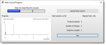 This dialog box is displayed when you click the Auto-Layout button and it shows the progress of the auto-layout process. If the layout is complex and the system requires a lot of time to arrange the products, you can click the Use button to accept the Best solution so far. Otherwise, wait until the process is complete and the Auto-Layout Progress dialog box closes. The longer you wait, the better the proposed sheet.
