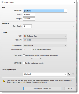 The Auto-Layout feature places and arranges all the selected products automatically on the sheet according to the chosen layout strategy. The products are placed on all the sheets of the job, including locked sheets.