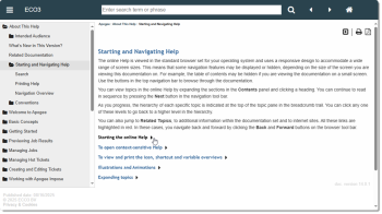 The online Help is viewed in the standard browser set for your operating system and uses a responsive design to accommodate a wide range of screen sizes. This means that some navigation features may be displayed or hidden, depending on the size of the screen you are viewing this documentation on. For example, the table of contents may be hidden if you are viewing the documentation on a small screen. Use the buttons in the top navigation bar to browse through the documentation.