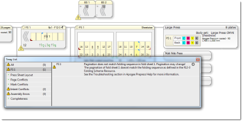 An old job or ticket template that uses an asymmetrical Folding Scheme/Web Production Scheme was always imposed symmetrically with symmetrical pagination. In this case you will see the message attached to the book signature icon (BS) in the assembly pane and you will be prompted to check the Folding Scheme/Web Production Scheme in the resources. If you do not review the imposition, your output may be different than the last time.