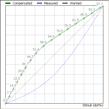 The screenshot below shows a compensation curve for a 20% difference between the Wanted and the Measured values.