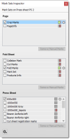 The Mark Sets Inspector is available in the Product View and the Press Sheet View. This inspector lists all the Mark Sets by category and in the same order as they appear in the Mark Engraver. Only information relevant for the current selection is shown.