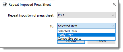 The Repeat Imposed Press Sheet dialog is displayed with the selected Press Sheet in the top drop-down list as reference imposition.