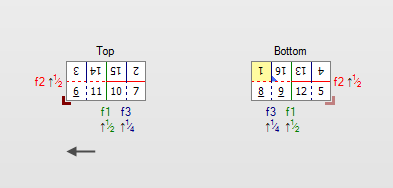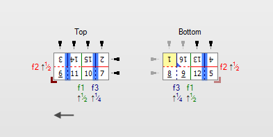 1 Red corner icon: Lay on Front 2 Red corner icon (faded): Lay on Back 3 Yellow page: The lowest page number of the signature 4 Blue corner icon: Top page of the signature 5 Page numbers: rotated according to the rotation of the page on the Fold Sheet; ambiguous numbers are underlined 6 Fold lines which are colored (green, blue, red) - solid line: if the pages are still on top - dashed line: if the pages are underneath 7 Fold line labels in the same color as the lines and as an extension of the line; f1, f2, f3, etc. indicate the sequence of the folds 8 Jog edges in solid black and non-jog edges in gray |