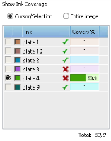 7 In the Inks palette, you can check whether the ink coverage for the two images is the same (indicated with a green check mark) or not the same (indicated with a red cross).