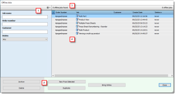 Main panel shows a sortable list of offline jobs. You can sort by clicking column headers such as Order Number, Job, Customer, Create Date, and Delete In.