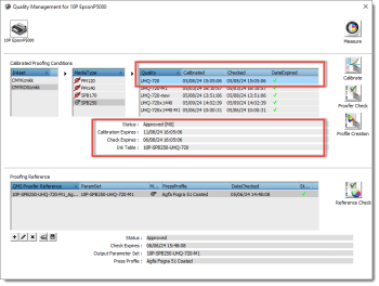 You will view details about the selected quality mode under the Calibrated Proofing Conditions table. If the Proofer has already been calibrated in the past for the selected quality mode, the Proofer Check button and Profile Creation button will also be enabled next to Calibration button.